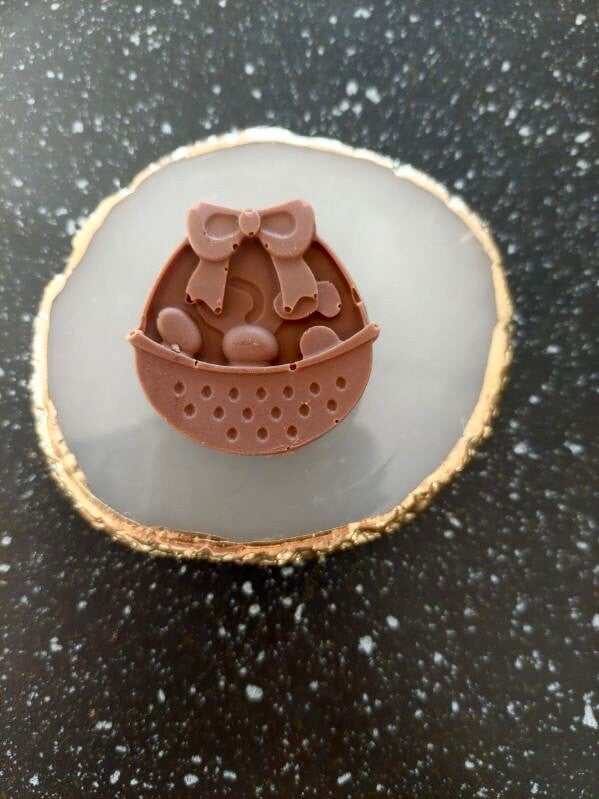 Påskchoklad pralin fylld med pistagesmör eller pekannötssmör och torkad frukt.
